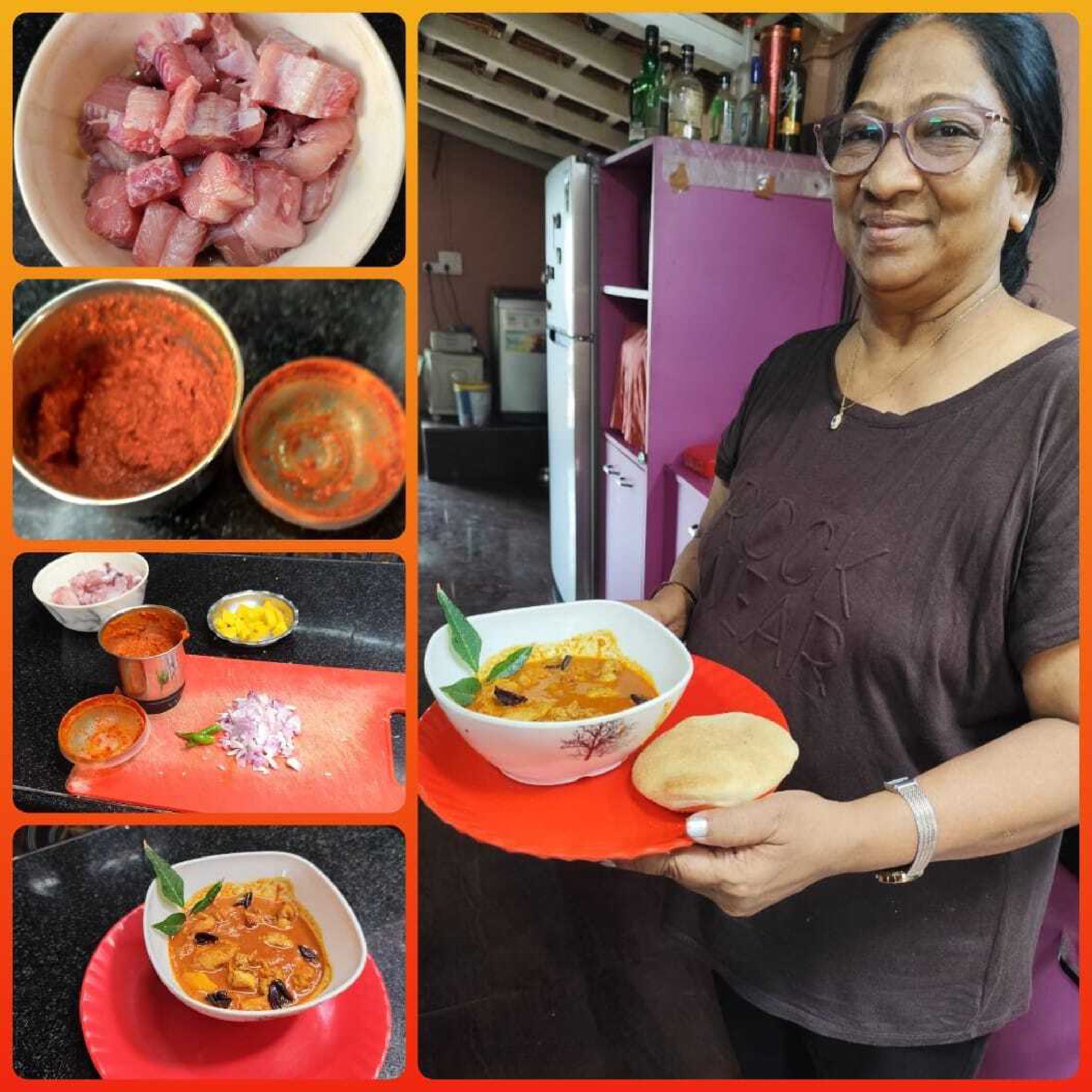 Leave it to boil, till the oil begins to float on the gravy then add the marinated shark pieces into it. Cook it for 7 to 10 minutes, add kokum or raw mango cubes. Put off the gas and cover the dish, the fish will continue to cook in hot gravy.